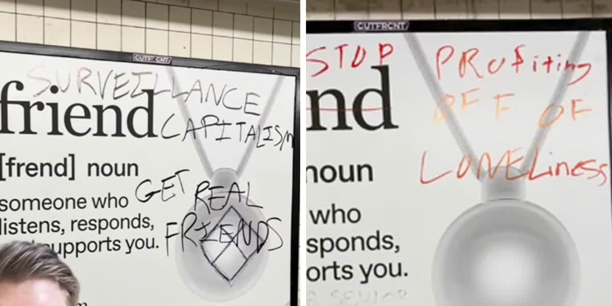 New Yorkers vandalize subway ads for AI companion “Friend,” calling it dystopian and accusing it of profiting off of loneliness.